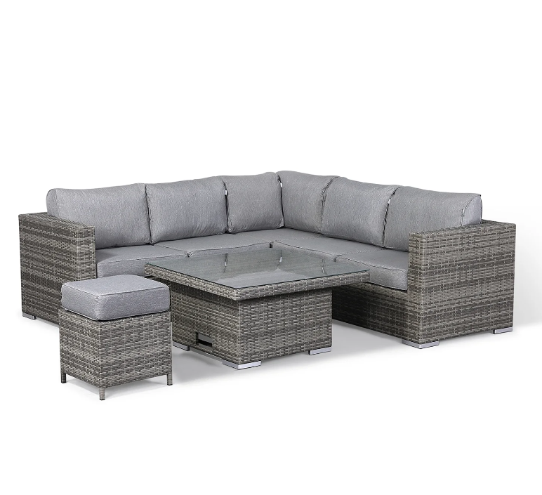 This 4-piece rattan sofa set is the perfect addition to any outdoor space. The corner sofa seats 5 people comfortably and is made in our premium Stone Grey synthetic rattan that is UV Treated. The rising table can be used as either a coffee or dining table.